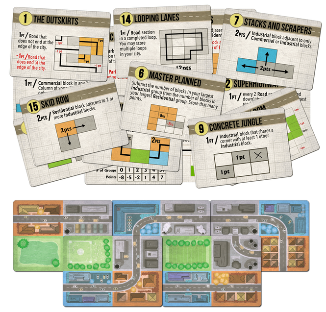Ook bij Sprawlopolis worden er drie doelen open gelegd, maar ditmaal staan er getallen bij. Het totaal van de getallen op de doelen bepaalt de doelscore die jullie minimaal met jullie stad moeten verdienen om het spel te verslaan. Iedere speler krijgt één gebiedskaart in de hand en de startspeler trekt er twee extra. De bovenste gebiedskaart van de stapel wordt in het midden van de tafel gelegd als beginpunt van de stad waar jullie samen aan gaan bouwen.